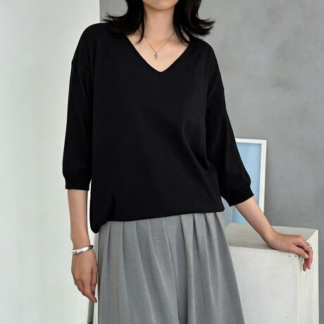 二の腕をふわっとカバーする六分袖に、デコルテをきれいに魅せるVネックとラウンドネックで、抜け感のあるヘルシーな印象に。