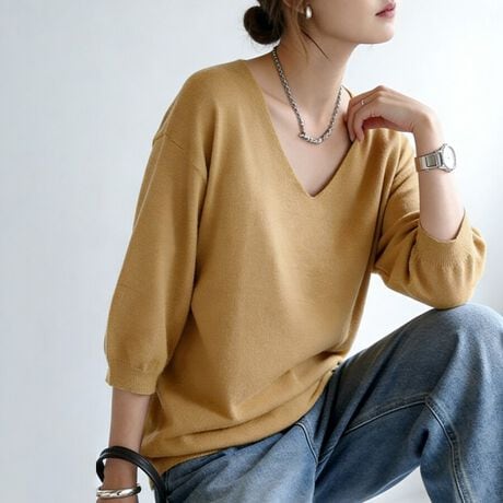 二の腕をふわっとカバーする六分袖に、デコルテをきれいに魅せるVネックとラウンドネックで、抜け感のあるヘルシーな印象に。