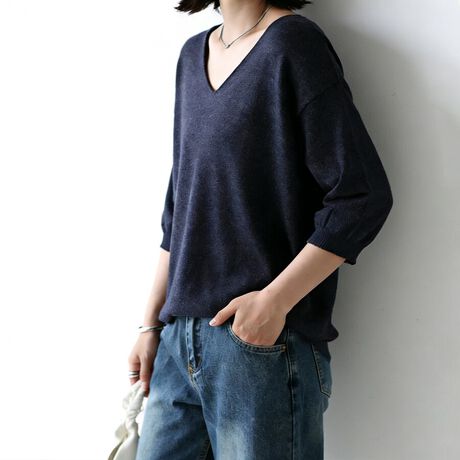 二の腕をふわっとカバーする六分袖に、デコルテをきれいに魅せるVネックとラウンドネックで、抜け感のあるヘルシーな印象に。