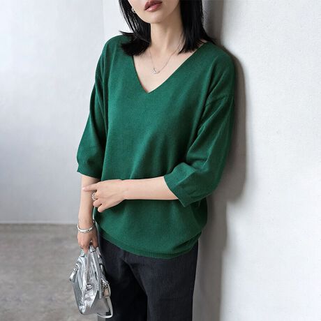 二の腕をふわっとカバーする六分袖に、デコルテをきれいに魅せるVネックとラウンドネックで、抜け感のあるヘルシーな印象に。