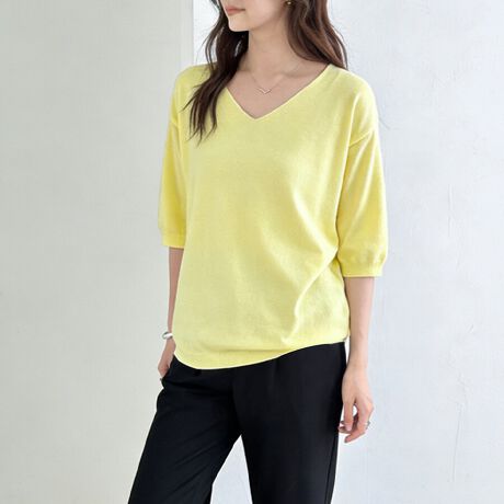 二の腕をふわっとカバーする六分袖に、デコルテをきれいに魅せるVネックとラウンドネックで、抜け感のあるヘルシーな印象に。