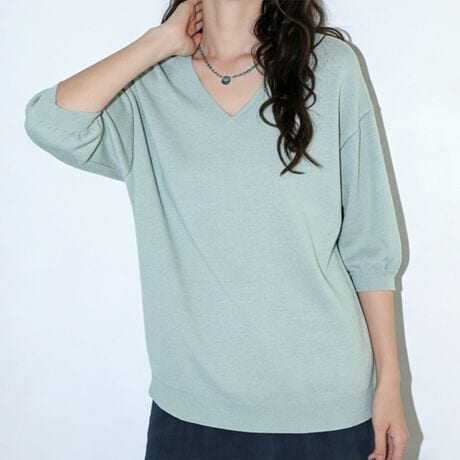 二の腕をふわっとカバーする六分袖に、デコルテをきれいに魅せるVネックとラウンドネックで、抜け感のあるヘルシーな印象に。