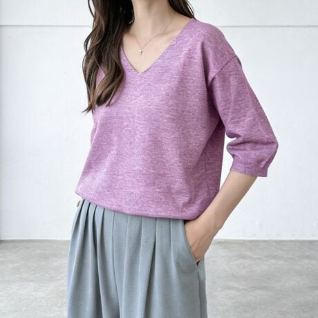 二の腕をふわっとカバーする六分袖に、デコルテをきれいに魅せるVネックとラウンドネックで、抜け感のあるヘルシーな印象に。