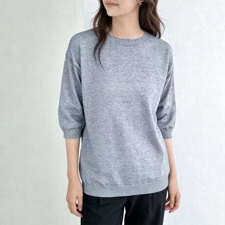 二の腕をふわっとカバーする六分袖に、デコルテをきれいに魅せるVネックとラウンドネックで、抜け感のあるヘルシーな印象に。