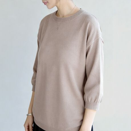 二の腕をふわっとカバーする六分袖に、デコルテをきれいに魅せるVネックとラウンドネックで、抜け感のあるヘルシーな印象に。