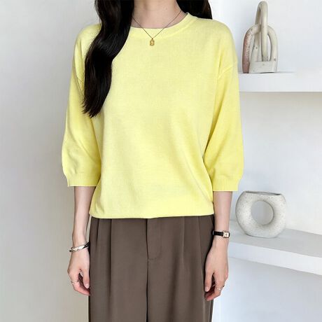二の腕をふわっとカバーする六分袖に、デコルテをきれいに魅せるVネックとラウンドネックで、抜け感のあるヘルシーな印象に。