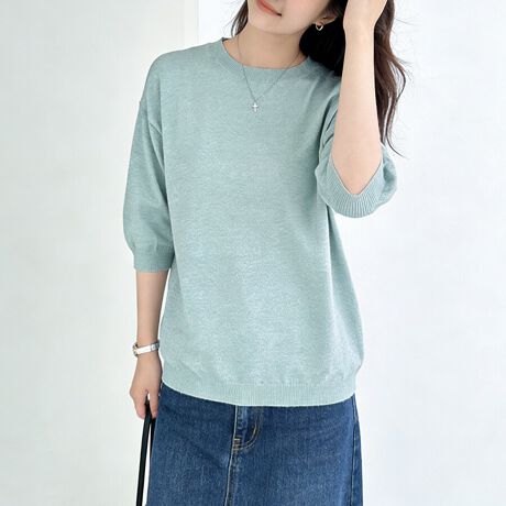 二の腕をふわっとカバーする六分袖に、デコルテをきれいに魅せるVネックとラウンドネックで、抜け感のあるヘルシーな印象に。