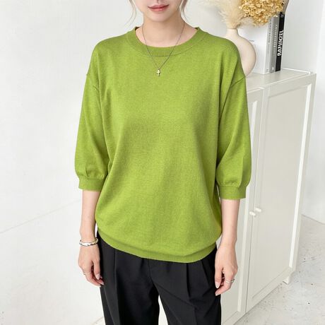 二の腕をふわっとカバーする六分袖に、デコルテをきれいに魅せるVネックとラウンドネックで、抜け感のあるヘルシーな印象に。