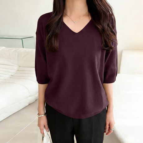 二の腕をふわっとカバーする六分袖に、デコルテをきれいに魅せるVネックとラウンドネックで、抜け感のあるヘルシーな印象に。
