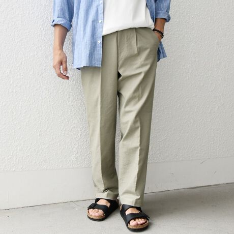 リネンをミックスする事で、所々に見られる糸ムラやシワ感がナチュラルな雰囲気を醸し出し、清涼感のある盛夏ボトムスに仕上がっています。