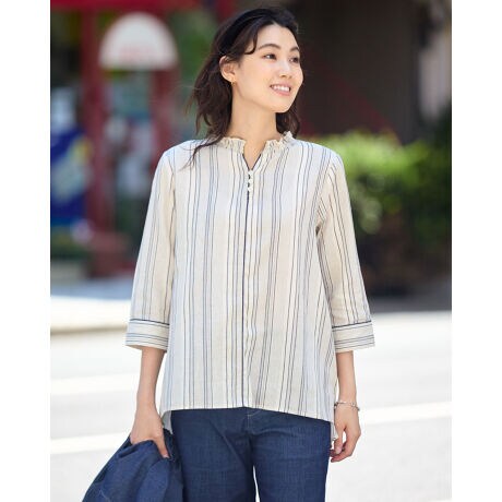 襟ぐりのシャーリングが柔らかな表情のランダムストライプブラウスです。