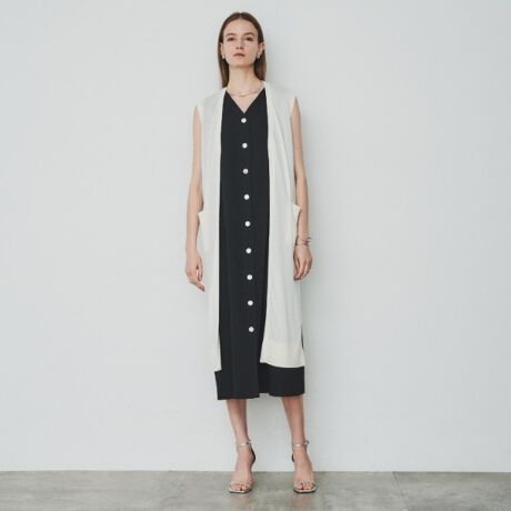 ベーシックなロングニットジレ。ボタンのない着流し羽織のデザインで仕上げています。