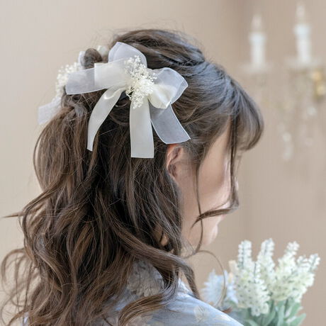 サテンリボン2本、オーガンジーリボン2本、ドライフラワーのかすみ草2本