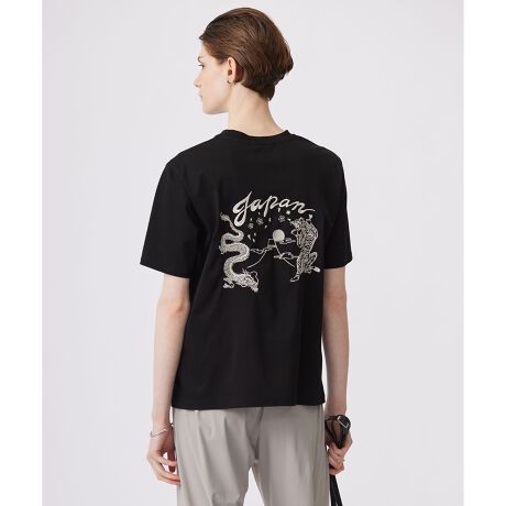 ■デザイン日本でのお土産=スーベニアアイテムということで、スーベニアジャケット(通称スカジャン)のデザインディテールをTシャツに落とし込んだアイテムです。ボディはカットソーの名産地尾州で編み上げたジャージー素材を使用し、刺繍も大阪の工場で繊細さにこだわって仕上げた完全メイドインジャパンとなります。刺繍のモチーフには日本を象徴する富士山、桜、2024年の干支である辰=ドラゴンと、スカジャンではドラゴンと対比になる虎を配し、一色刺繍といったシンプルながらも日本らしい配色ですっきり仕上げています。桜の花びらに似せたハートモチーフや、虎の模様にあるブランドの隠しロゴ、衿ぐりのさりげないラメの入ったテープ使いのディテールなど、ICBらしく仕上げているのもポイントです。オフホワイト×白刺繍(002)・ブラック×シルバー刺繍(005)・ホワイト×シルバー刺繍(102)の3色展開です。シルバーの刺繍には、黄味のある明るい銀色の糸を使用しています。