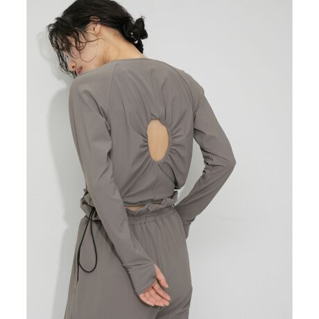 バッグのラウンドの開きは水中での水抜け機能を果たすとともにインナーの水着をチラ見せできる遊び心あるデザイン。サイドのドローコードで裾周りのゆとりと丈感を調節可能。袖口にサムホール付きで手の甲まで紫外線をカバー。