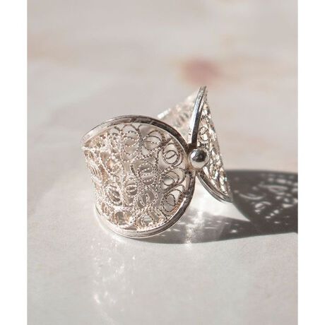 地中海に浮かぶマルタ島で500年続く伝統工芸品の銀細工「フィグリー」。ルネサンス時代から変わらぬ手法で受け継がれた、繊細なハンドメイドの芸術アクセサリーです。渦巻き模様が特徴で、リング幅が広く存在感のあるリング。涼しげな透かしとシルバーの輝きで、指先を上品に見せてくれます。生産者さんのサインと日付入りのカードと一緒に、ケースに入れてお届けします。大切な方へのプレゼントや自分へのご褒美、特別な日にぴったりなアクセサリーです。