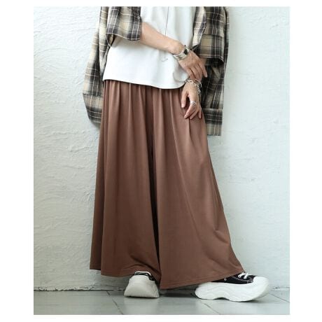 まるでスカートのような美ドレープのとろみガウチョパンツ。美しい落ち感とやわらかな肌触りが心地良いパンツです。女性らしいとろみ感あるドレープがしなやかなで心地よいフィット感です。上品で落ち着きある光沢感と発色の美しさも優秀なカットソー素材です。体型をカバーしながらスラッと伸びた美脚見せが叶います。