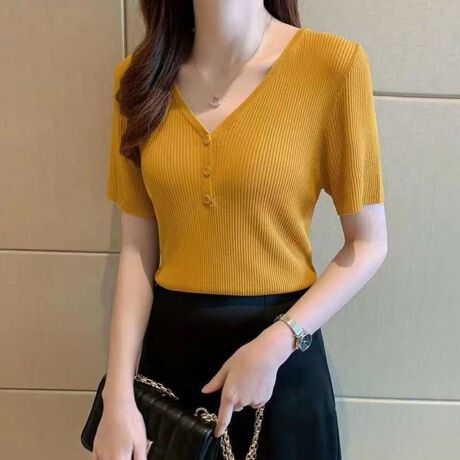 ボタンデザインリブトップス