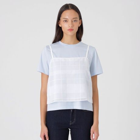 シアー感のあるクレストブリッジチェック素材を前身に使用したキャミソール付きのTシャツです。