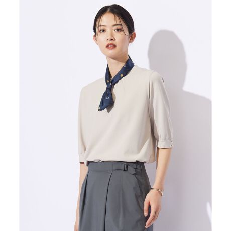 二の腕をカバーする肘丈がクラシックな印象のギャザースリーブニット。昨年から襟の高さを微調整し、程良いスタンドカラーに仕上げました。胸元のギャザーを効かせたブラウスライクなデザインが、より一層秋の気分を盛り上げます。小さなゴールドボタンをアクセントとして、バックスタイルと今年は袖口にもプラス。前裾を短めにした、すっきり見えのラウンドヘムのため、パンツとの着合わせもおすすめです。同素材のカーディガンやニットもご用意しています。カラーは、女性らしいアクセントになるローズピンク(#012)、肌なじみが良く柔らかな印象のベージュ(#033)、爽やかで洒落感のあるブルーグレー(#074)、オンオフ問わず活躍するネイビー(#075)の4色展開です。