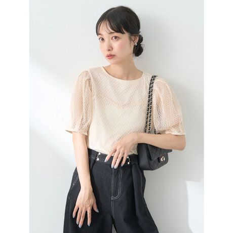 透け感あるレース素材のタックスリーブが女性らしさを演出するプルオーバー。