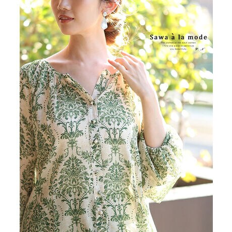 ナチュラルグリーンのダマスク柄シャツブラウス。色鮮やかなグリーンのダマスク柄が華やかでエキゾチックな世界へ導きます。ゆったりとしたシルエットやふんわり袖が抜け感を演出。体のラインを拾わないので着痩せにもオススメです。シンプルなボトムスもパッと華やかにしてくれる1枚です。
