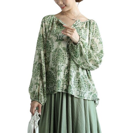 ナチュラルグリーンのダマスク柄シャツブラウス。色鮮やかなグリーンのダマスク柄が華やかでエキゾチックな世界へ導きます。ゆったりとしたシルエットやふんわり袖が抜け感を演出。体のラインを拾わないので着痩せにもオススメです。シンプルなボトムスもパッと華やかにしてくれる1枚です。