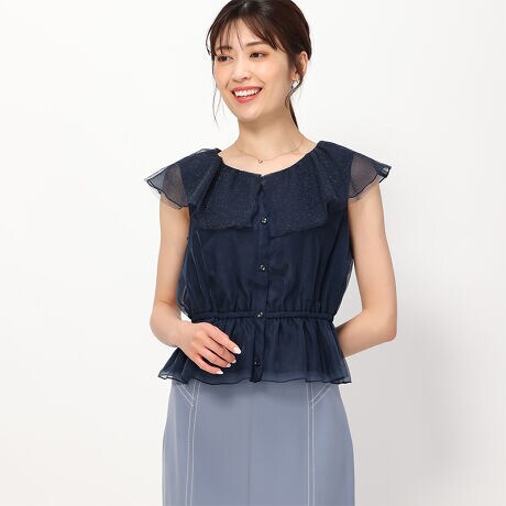 ほんのりと透け感のあるラメチュールが施されたブラウス。ウエストにギャザーを寄せることで、メリハリのあるシルエットを演出します。シーズンらしいノースリーブのルックスもポイント。タイトスカートと合わせたコーディネートがおすすめです。