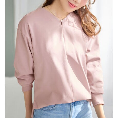 ・程良い開きのVネックにパールをプラスし、アクセいらず。