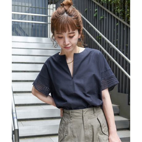 綿麻袖レースブラウス