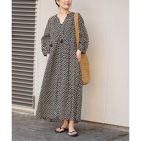 大人カジュアルに着やすいダイヤ柄プリントのインド綿ワンピースです。