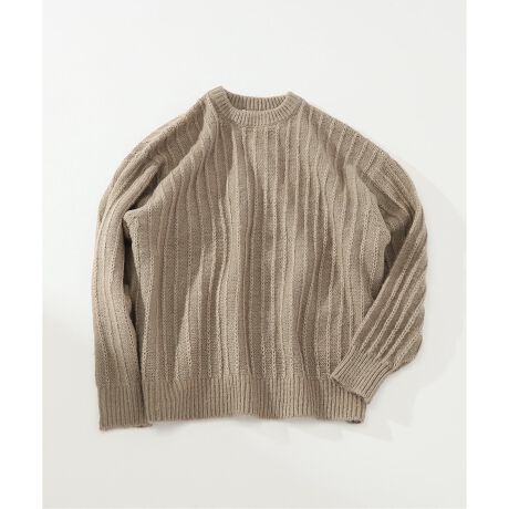 シンプルなクルーのニットですが、細いケーブルが走った様な編み柄になっており少しデザイン要素になっています。