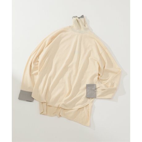 上からジャケットやシャツなどを重ねた時に袖口もシャツ地のカフス使用にしてあるのでこちらも重ね着風に見えるデザインになっており、キチンと感のあるコーデに見える様に工夫しました。