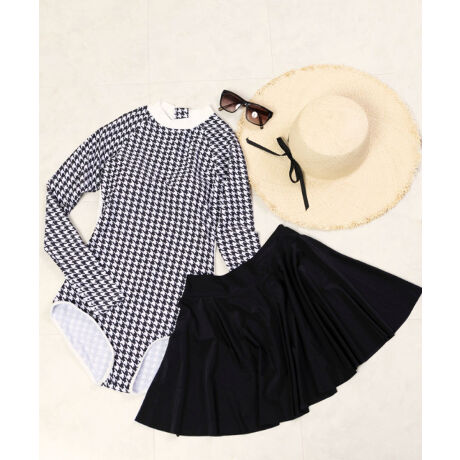 リゾート感のあるモノトーンのワンピース水着にフレアたっぷりのスカートが付いた着やすい2点セット