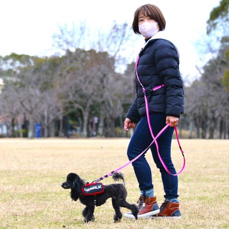 両手が使える3Wayハンズフリーマルチリード。肩に斜め掛けにして使用することでハンズフリーとなり、安全性の高いロック機能付き軽量カラビナスイベルを採用しているのでリードがねじれにくく快適に散歩が可能です。リードを腰掛けや通常のハンドリード、2頭用リードとしてもご利用頂けます。小型犬〜大型犬まで、ちょうど良い長さに設定できます。