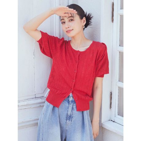 リボン柄透かし編みニットカーディガン