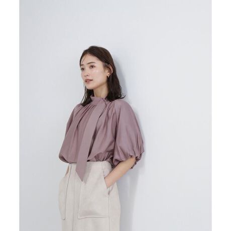 昨年大人気だったデザインブラウスが今年も登場!ハンサムもフェミニンな着こなしも楽しめるニュアンシーな4色を揃えました。スタンドネックから繋がる長めのサイドタイがエレガントな印象の着映えブラウス。襟ぐりのメタル釦と、ボリュームのあるバルーンスリーブが華やかさをプラスしてくれます。キレイめスカートやパンツ合わせで通勤シーンはもちろん、今年はデニムパンツ合わせでカジュアルダウンするのもおすすめです。<素材>やや透け感と光沢感のある、軽やかな素材を使用。<詳細>仕様・前ボタン裏地・身頃はなし、袖はあり透け感・ややあり / 光沢・ややあり / 伸縮性・なし 生地の厚さ・薄手※モデルの着用画像の場合、光の当たり具合により、実際の色味と異なって見えることがございます。色味は、商品単体の画像をご参照ください。