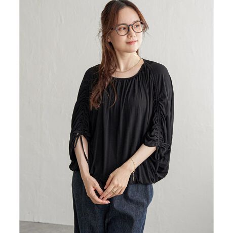 フレンチスリーブから7分袖まで、トレンドのリボンギャザーで調整できる便利なデザインカットソー。