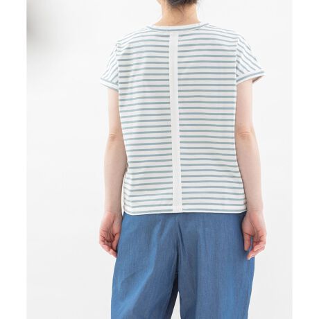 ほどよく肩が隠れるおなじみのフレンチスリーブTシャツ型を、国産機能素材を使用し、後ろ中心のライン切り替えをポイントにしたアイテム。接触冷感・透湿・UV CUTNをほどこした微強撚糸を引き揃えて編んだ天竺。極限までハイゲージで編んでいるために、目面も綺麗で光沢感もあります。透け感がなくしっかりとした肉感がありながらもしなやかさのある生地です。