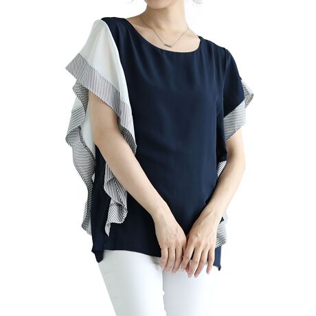 ストライプフリルが流れる爽やかなカットソー。ストライプ柄のフリルが風に揺れる爽やかな配色がお洒落なデザイン。アシンメトリーな配色は個性的で着るだけで映える1枚です。大きなフリルは肩周りから腕を華奢に見せてくれます。どんなボトムスにも合わせやすく品のある清楚な印象にしてくれます。