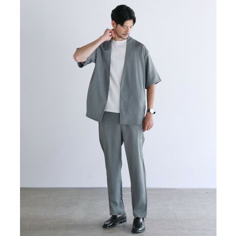 接触冷感テックリネンノーカラー半袖カーデ&テーパードパンツセットアップ