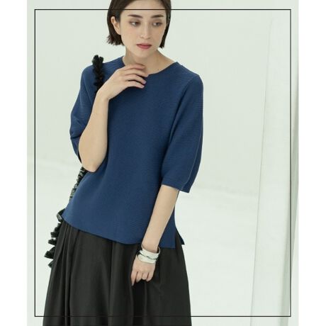 ・コットン素材をベースにポリエステル糸をプレーティングし、ガーター編みにする事で表情のある編地に仕上げています。