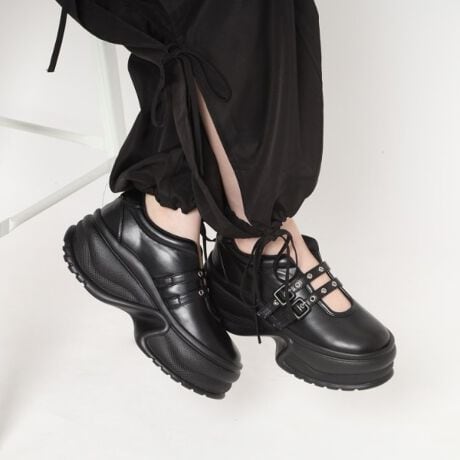 スニーカー底にバレエシューズを思わせるアッパーをのせたデザインは甲ストラップ仕様で着脱をラクチンに。