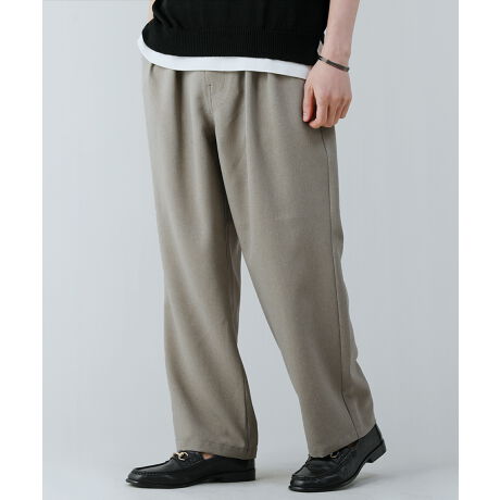 リラックス感あふれるゆったりとしたワイドシルエットで幅広い体型をカバーし、ウエストにゴムとドローコードを配したイージーパンツ仕様でジャストサイズでの着用が可能です。ベルトループを備えているのでタックインスタイルもサマになります。