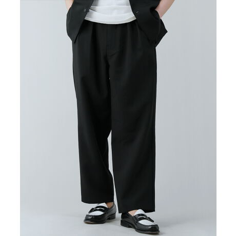リラックス感あふれるゆったりとしたワイドシルエットで幅広い体型をカバーし、ウエストにゴムとドローコードを配したイージーパンツ仕様でジャストサイズでの着用が可能です。ベルトループを備えているのでタックインスタイルもサマになります。