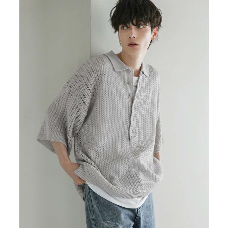 オーバーサイズ透かし編み半袖ハーフボタンニットシャツ