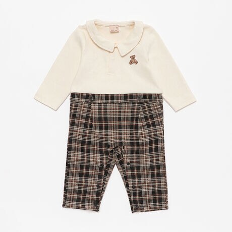チェック柄とクマの刺しゅうが愛らしい衿つきカバーオールです。しなやかでさらっとした素材感で、やさしい肌触りに仕上げました。股部分にボタンをあしらいお着替えやおむつ替えがしやすいのもうれしいポイント。内側にお名前を記入できるタグがついています。【おすすめの着用時期は秋冬シーズン】【透け感】透けない【生地の厚さ】普通【伸縮性】あり【裏地】なし【ポケット】なし