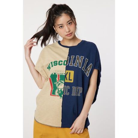 スラブ糸を使用した雰囲気のあるドッキングトップス。2種のカレッジTシャツをドッキングしたようなリメイク風デザインで、さらりとデニム合わせでも様になるアイテム。袖口は後ろ身のみゴムを入れることで、バックスタイルがドレープデザインになり、気になる腰回りを隠してくれます。■ポケット:なし■裏地:なし■透け感:ややあり■伸縮性:あり※プリントの風合いやカラー及び位置には個体差が有りますが、二次加工特性によるものです。プリントを重ねるとくっついたり色移りの可能性がありますので、注意してください。プリント商品の為、着用・洗濯によリ白化する場合がございます。