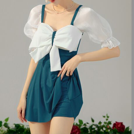 目を引く大きなリボンと甘いフリルが大人可愛いワンピース水着2点セット