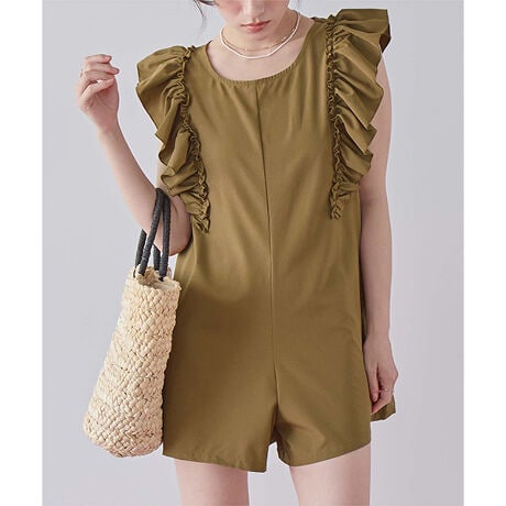 ・ボリュームのあるショルダーフリルデザインが大人可愛いロンパースタイプ水着。